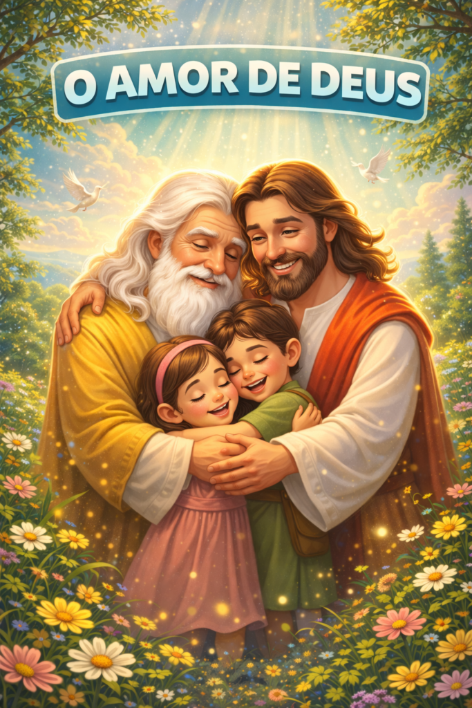 O ebook O Amor de Deus, com histórias bíblicas, atividades e pinturas para ensinar valores cristãos às crianças de forma divertida.